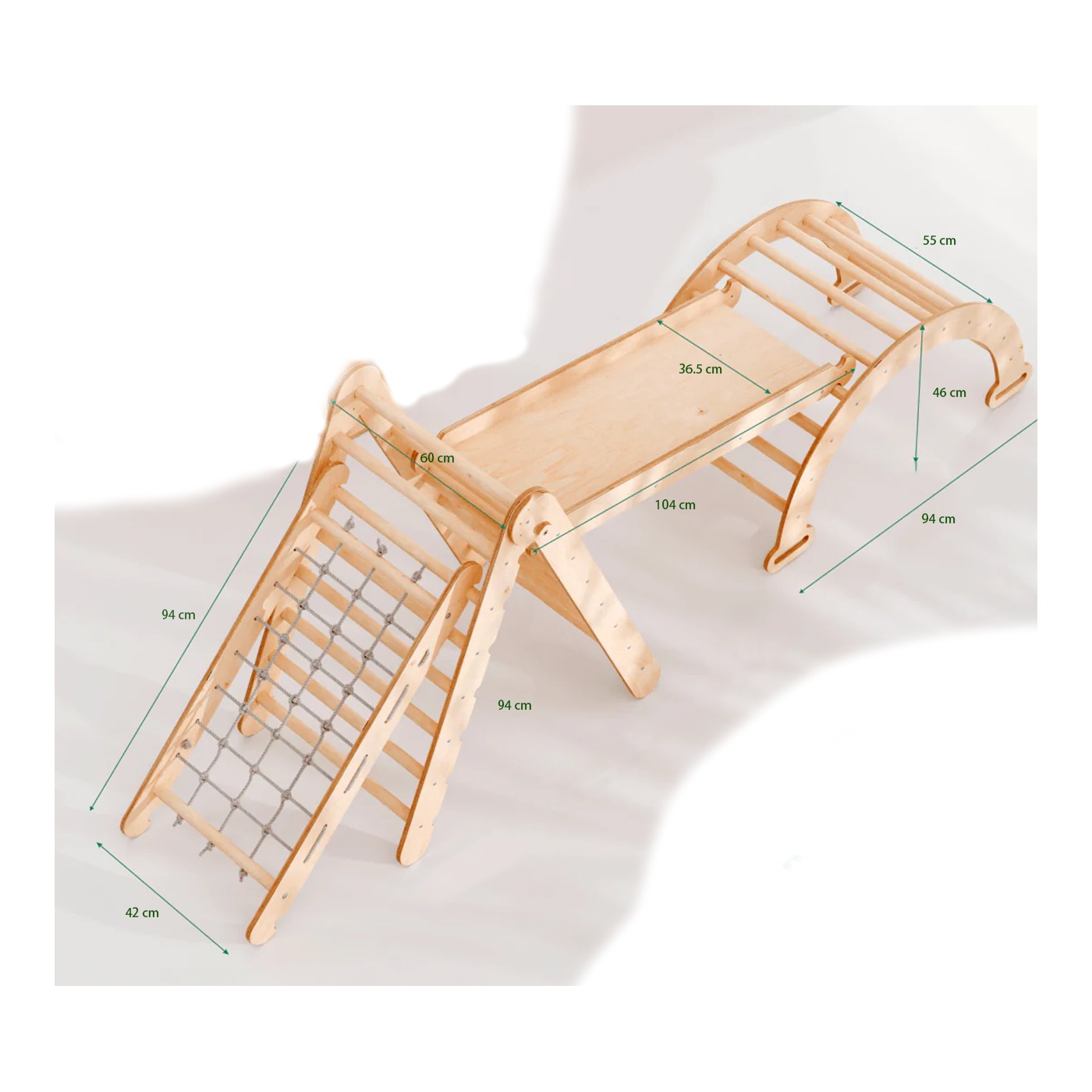 - Αψίδα αναρρίχησης – επιτρέπει την αναρρίχηση στην τριγωνική σκάλα. Μπορείτε επίσης να αναποδογυρίσετε την καμάρα για να τη χρησιμοποιήσετε ως κουνιστή ή να προσθέσετε ένα μαξιλάρι και να την κάνετε τη ζώνη άνεσης του παιδιού σας.